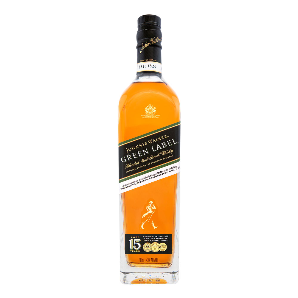 Johnnie Walker Green Label is the blended malt scotch whisky, delivering all the character of a single malt whisky, but with a greater depth and wider flavour experience. Made from malts matured at for at least 15 years in American and European Oak to ensure that the flavours work in harmony to create a blend of great complexity with big, bold flavours and signature smokiness.